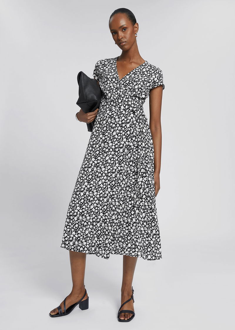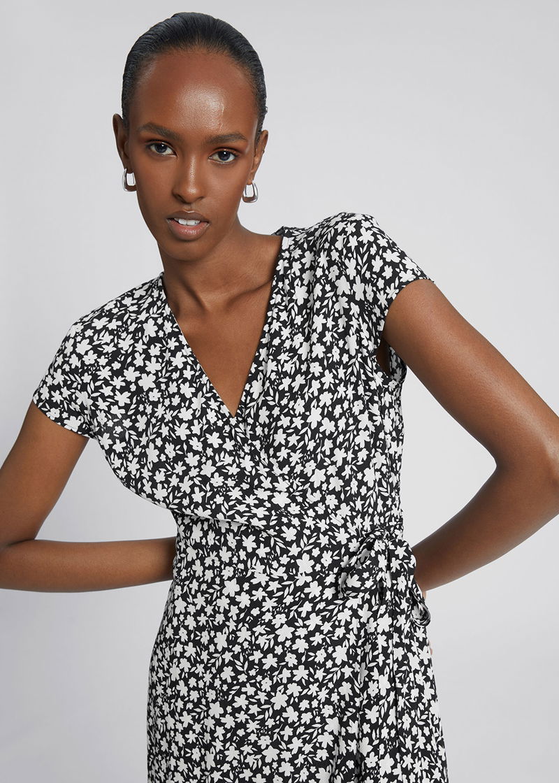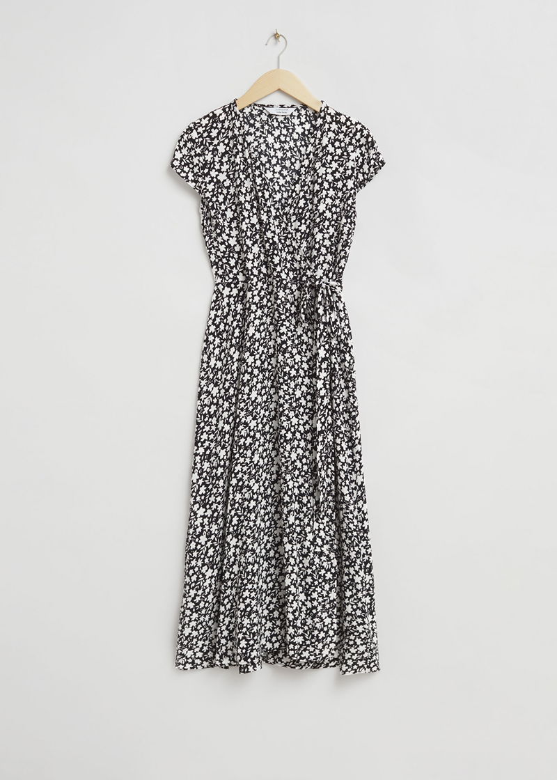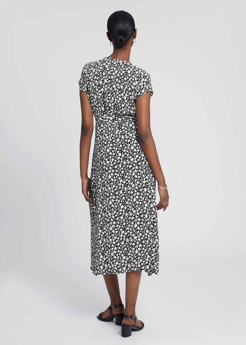 Printed midi wrap dress with short sleeves, a v-cut neckline and self-tie detail at the side in a slim-fitting silhouette.