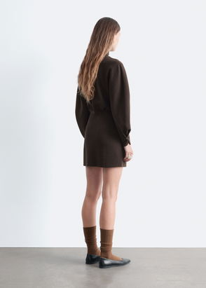Slightly patterned fabric shapes this little black dress, defined by the modern mock neck, straight body and voluminous sleeves.