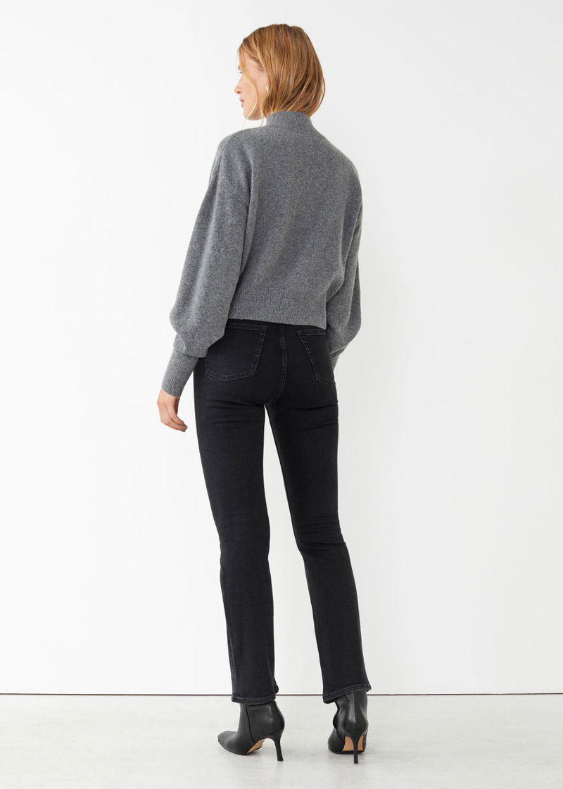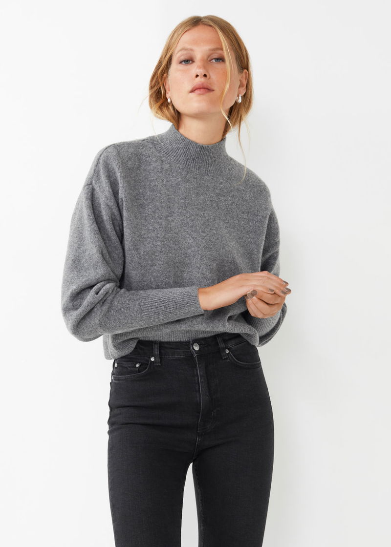 Mock neck knit sweater with dropped shoulders and a straight silhouette.