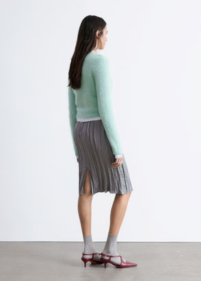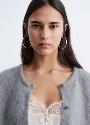 Knitted from a brushed mohair and wool blend, this long-sleeve cardigan is cut in a short, slim silhouette with a round neckline, button closures down the front, and ribbed trims.