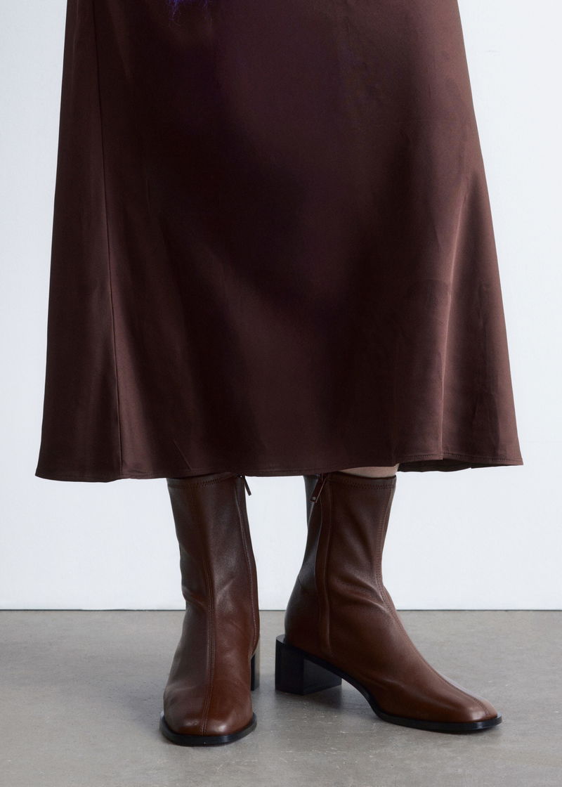 Designed for effortless everyday wear, these squared-toe sock boots are crafted from stretch nappa with topstitched centre seams and a concealed side zipper. Set on chunky block heels that’re slightly offset for a sculptural touch.