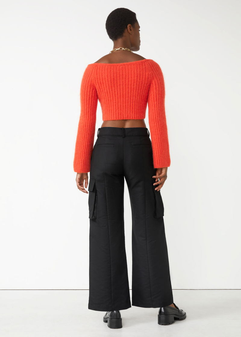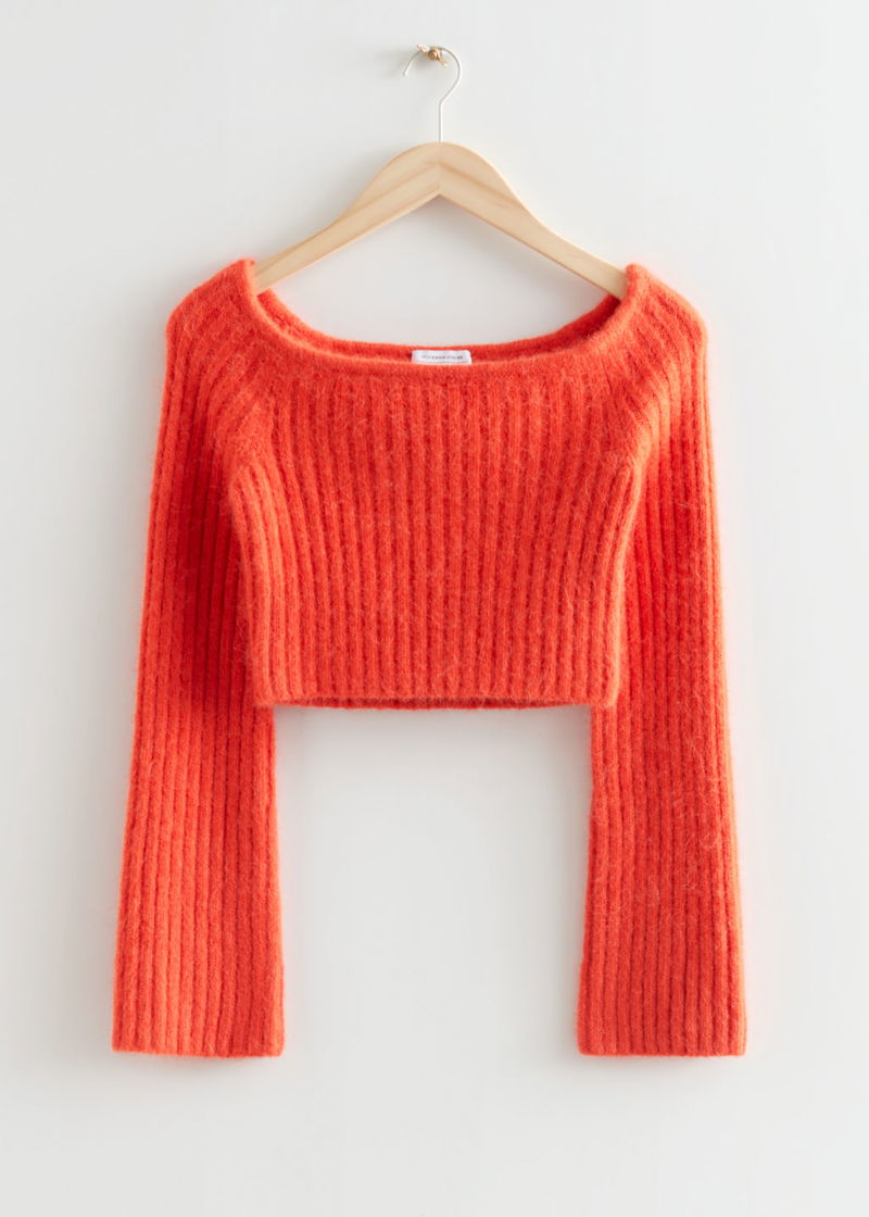 Knitted off-shoulder top with a cropped, fitted silhouette and a ribbed finish.
