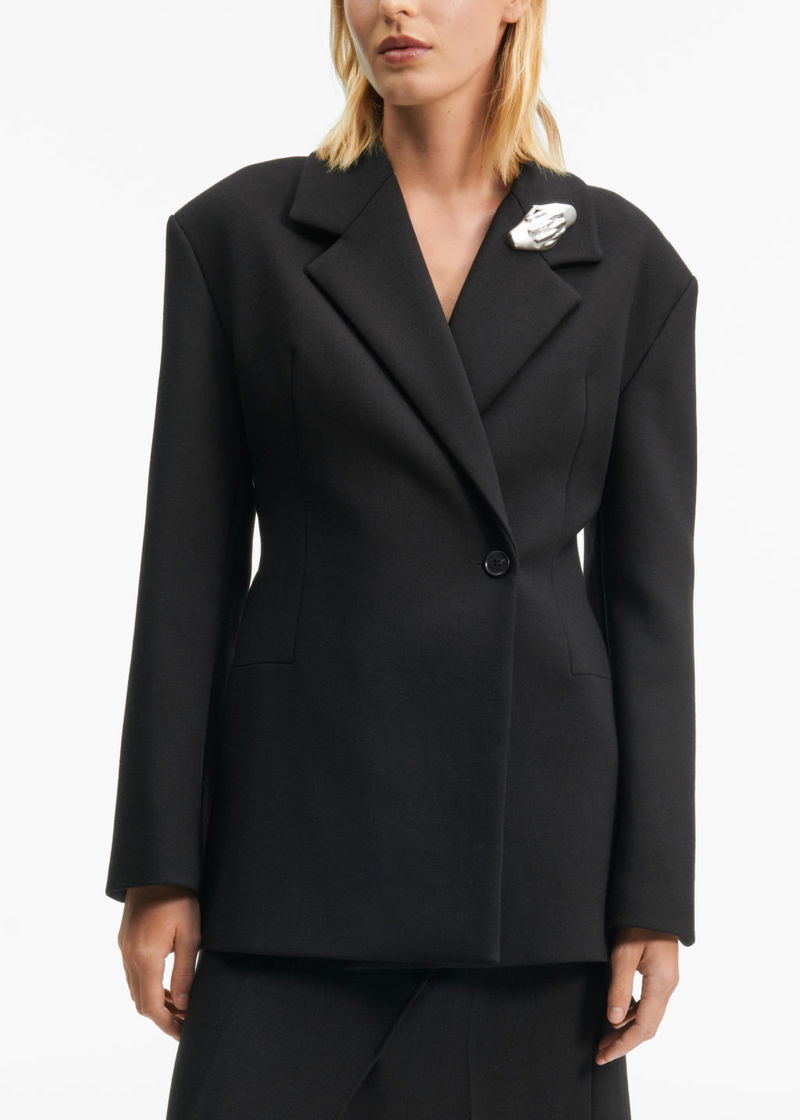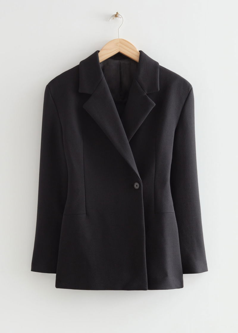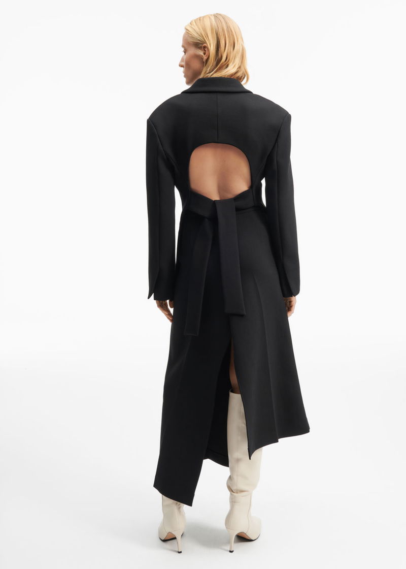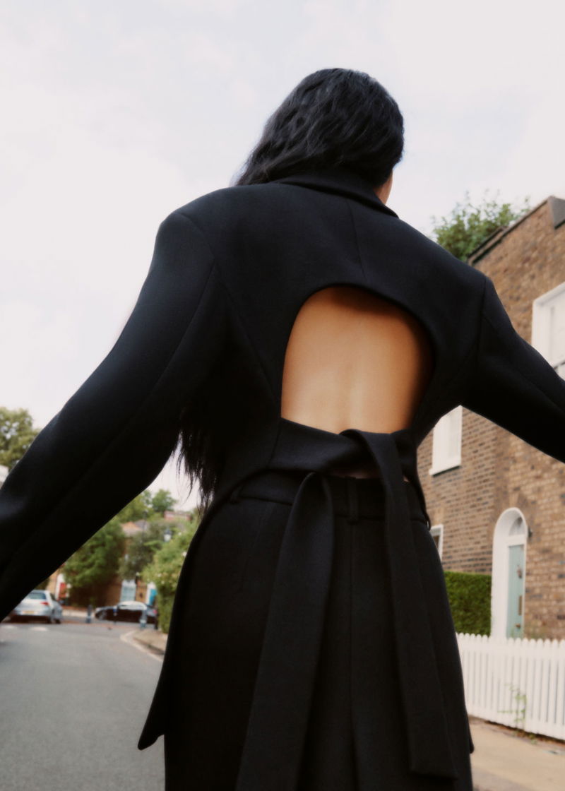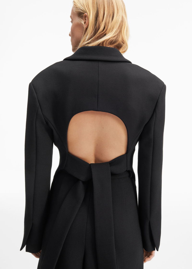 Single breasted open back blazer secured with a single button, featuring a tie back.