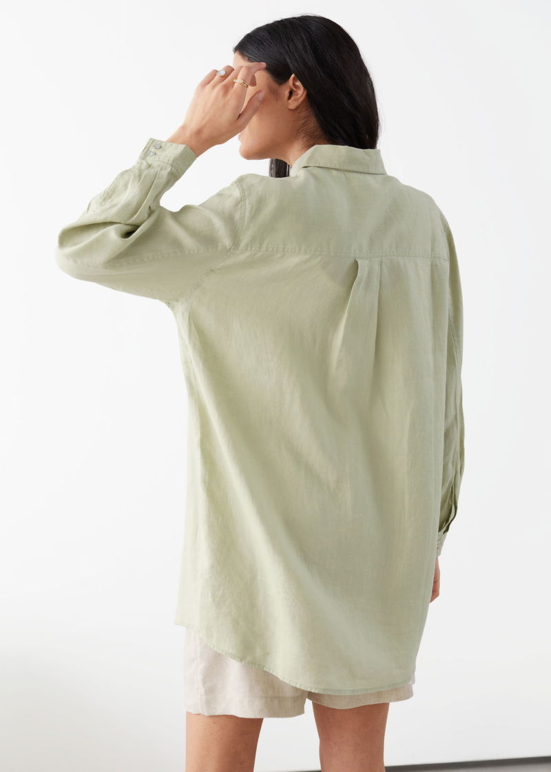 Oversized linen shirt finished with double needle topstitches and a chest patch pocket.