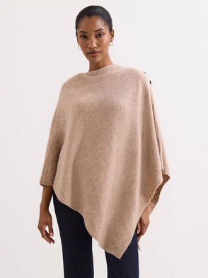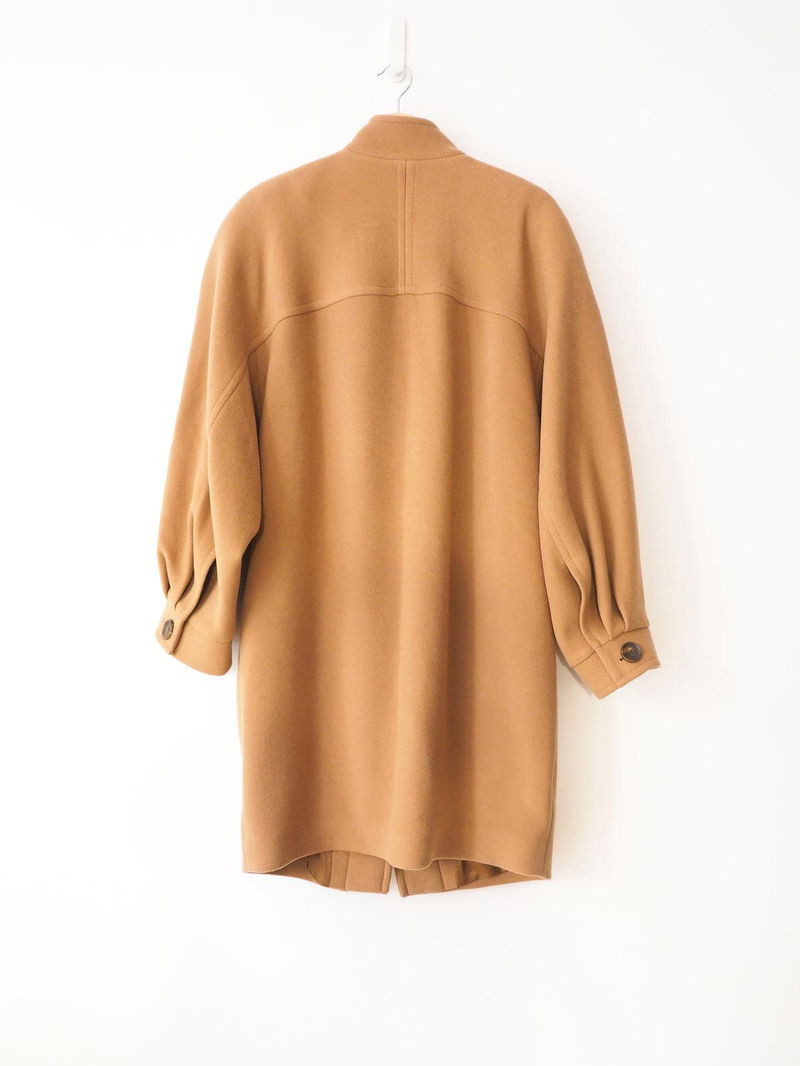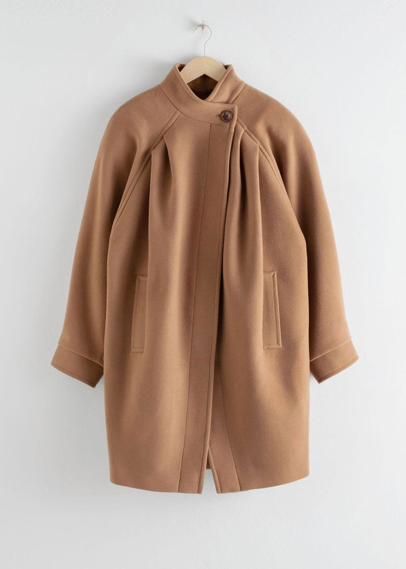 Wool blend twill coat with a high mock neck finish, featuring a single side-button closure and semi-open oversized silhouette.