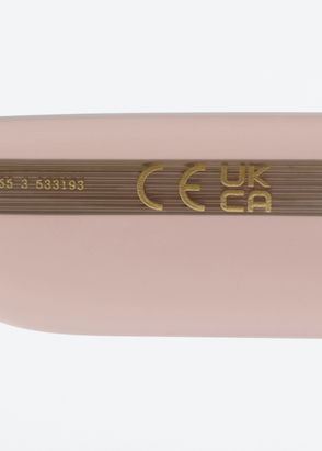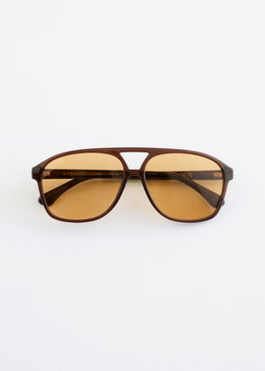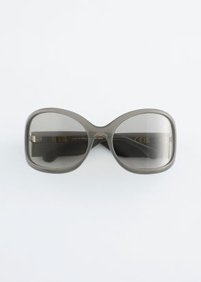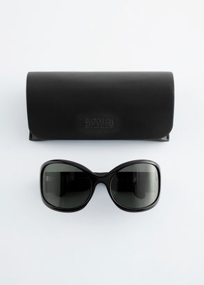 They’re fitted with tonal lenses and complemented by wide, low-set temples to amplify the exaggerated silhouette.