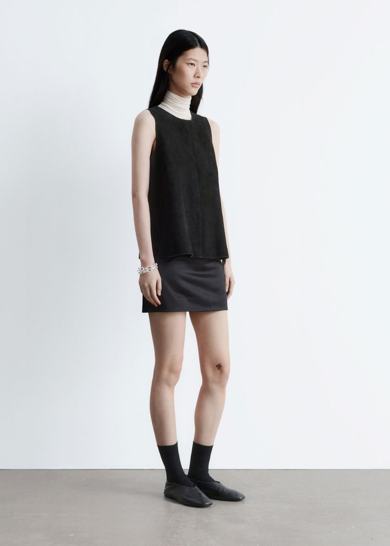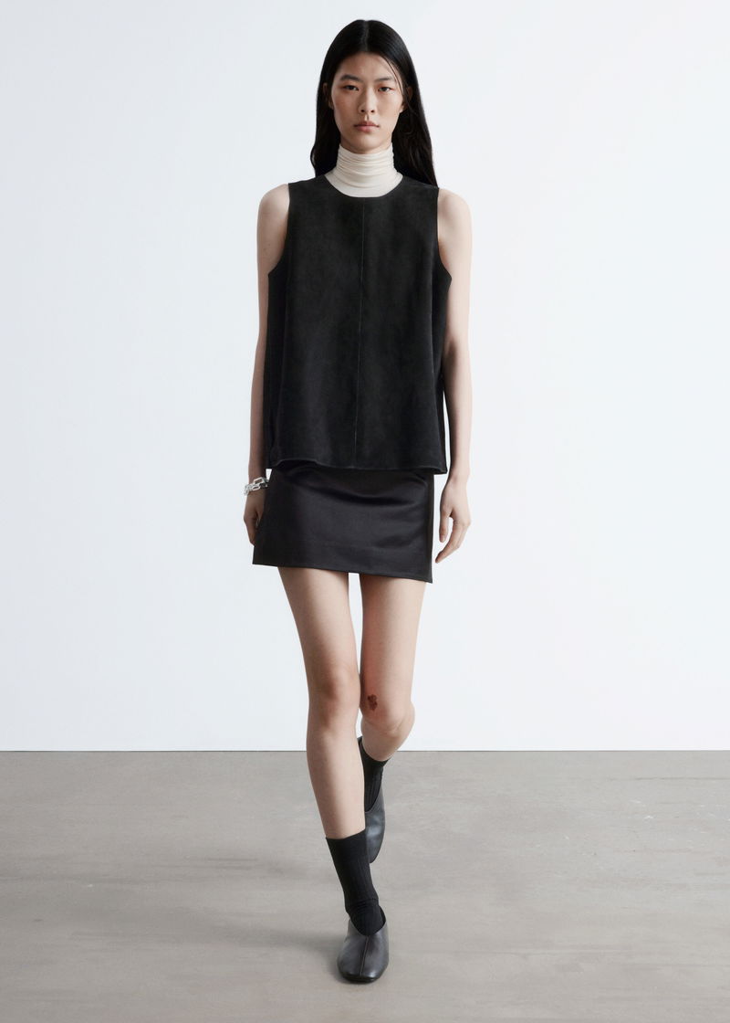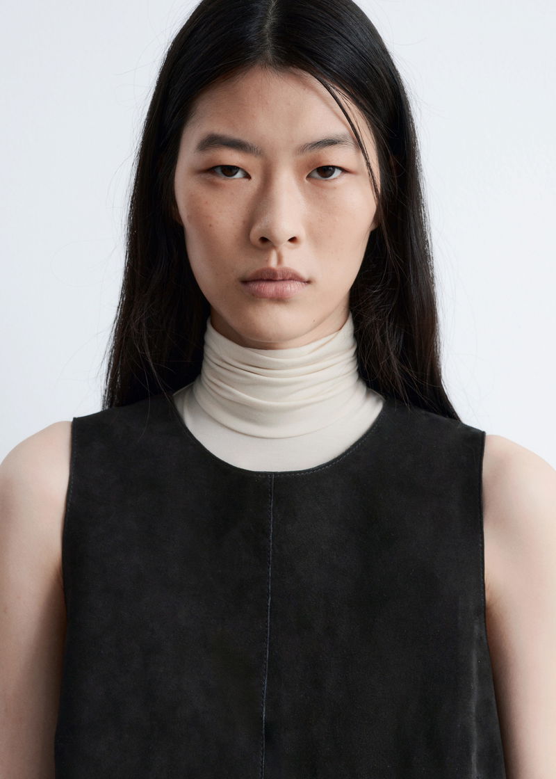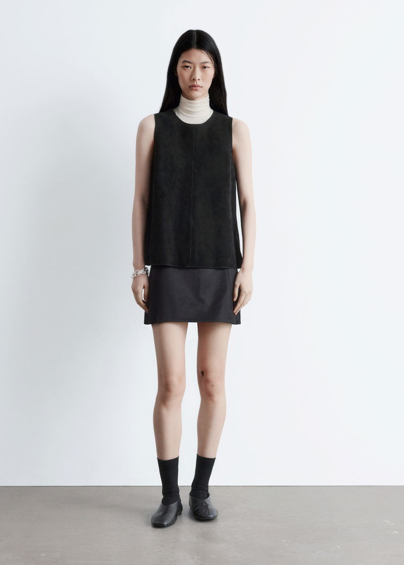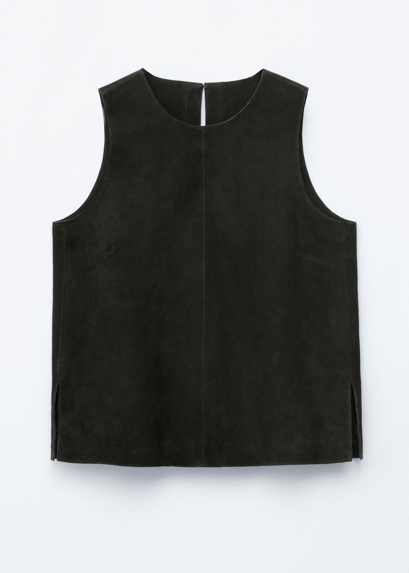 Crafted from soft suede, this sleeveless top is cut in an oversized boxy silhouette with visible seams and bust darts. It features a round neckline, slits at the hem and a slit and hook-and-eye fastening at the back of the neck.