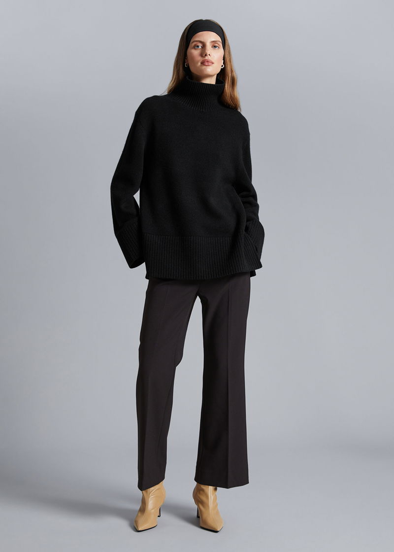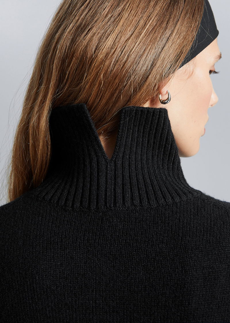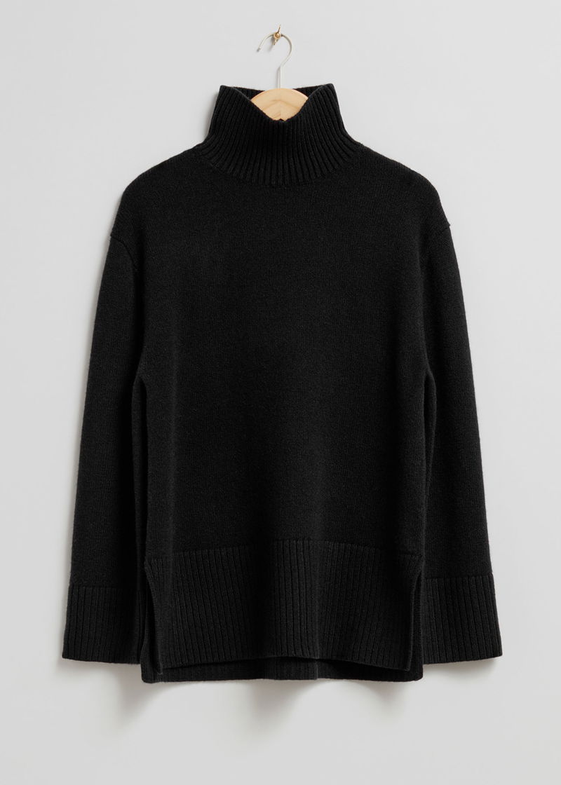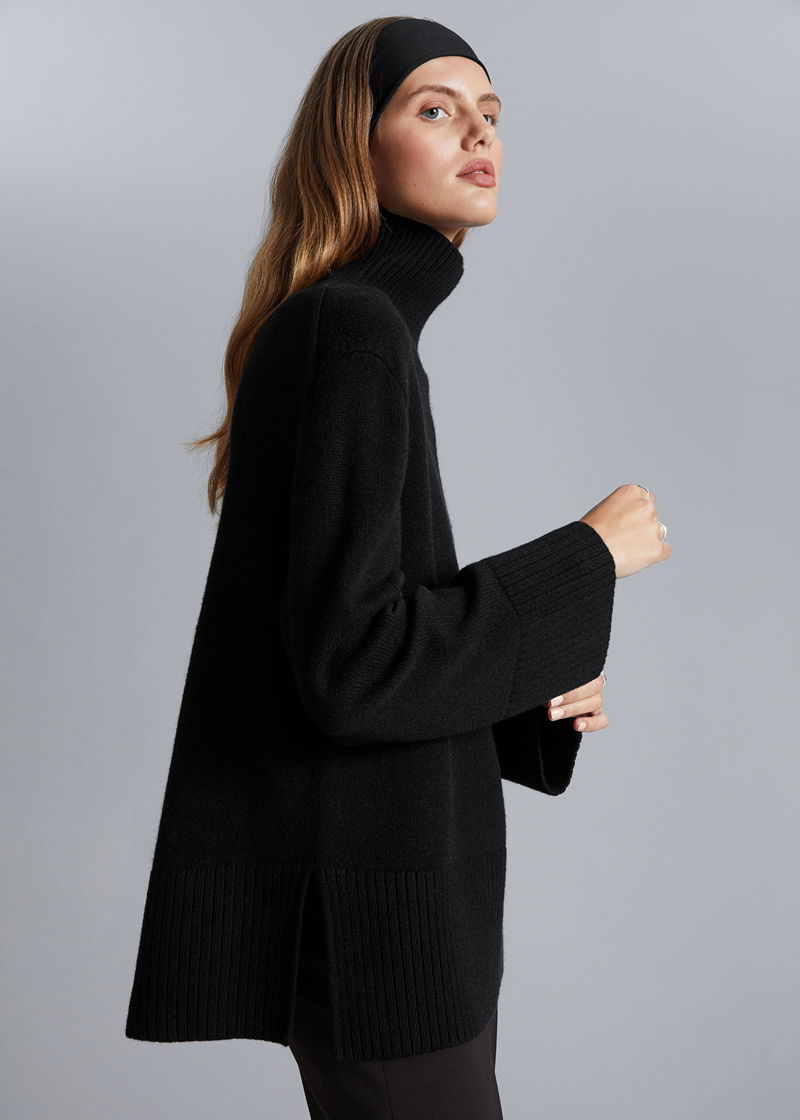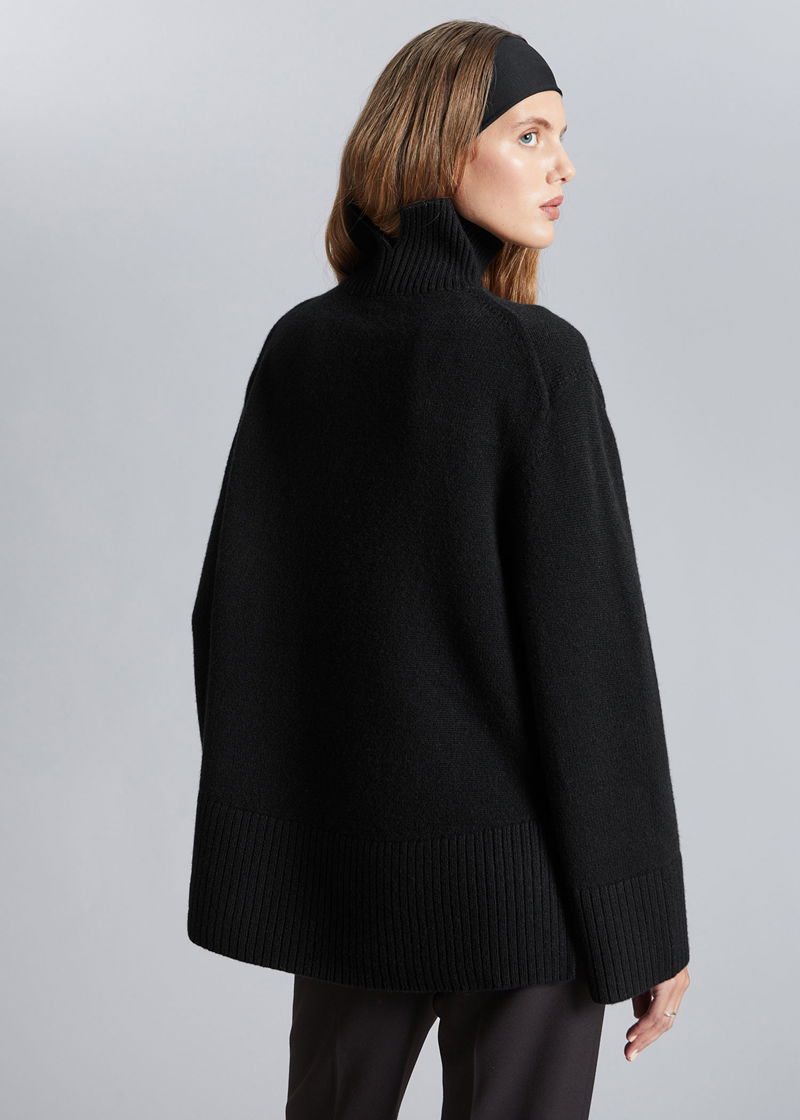 Turtleneck wool knit jumper with an oversized silhouette and a slit at the back collar. Ribbed collar, cuffs and hemline.