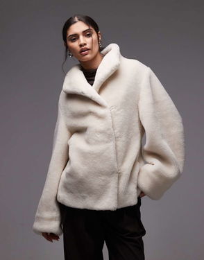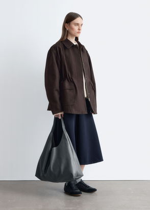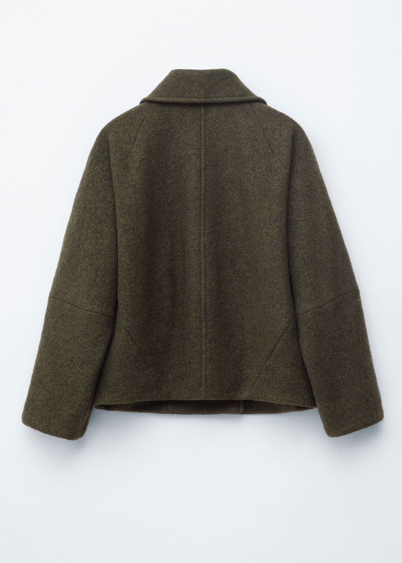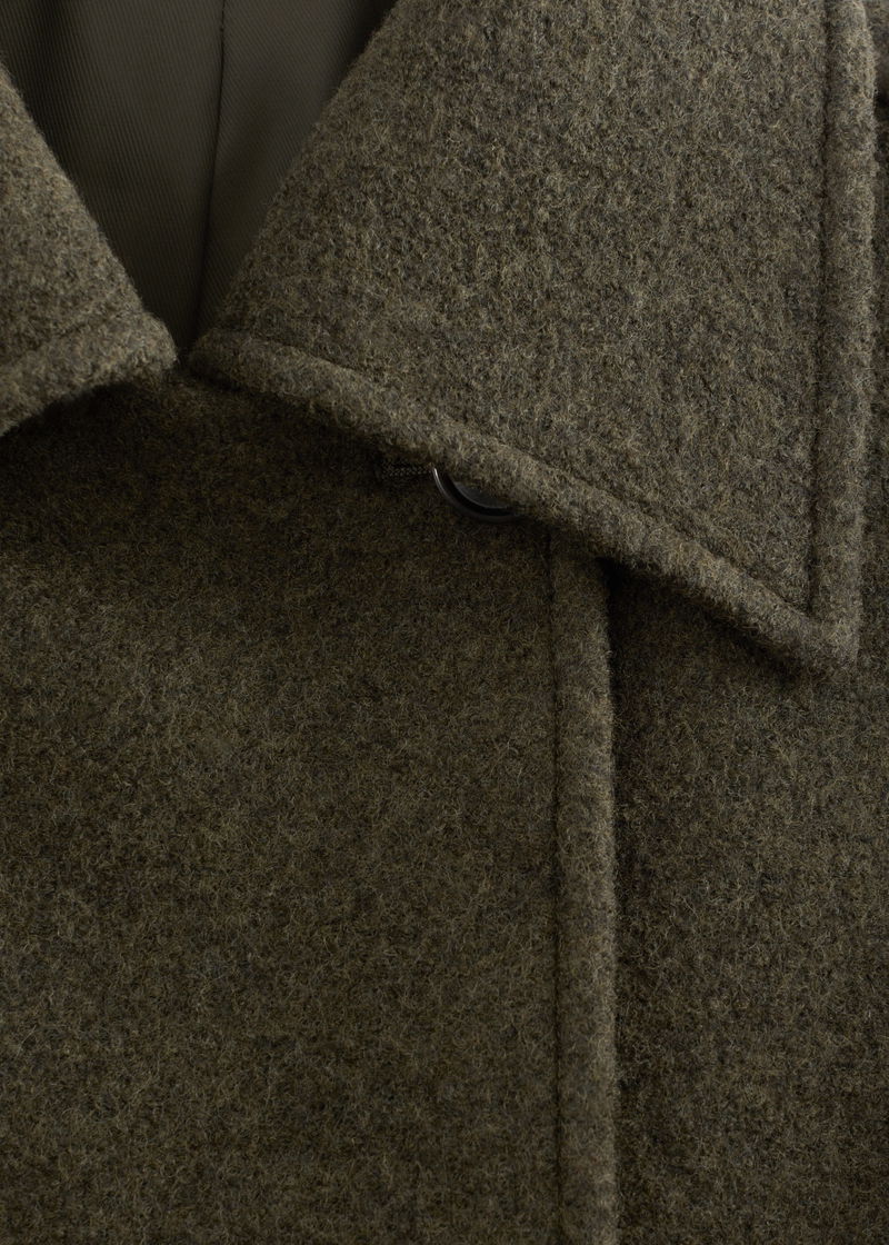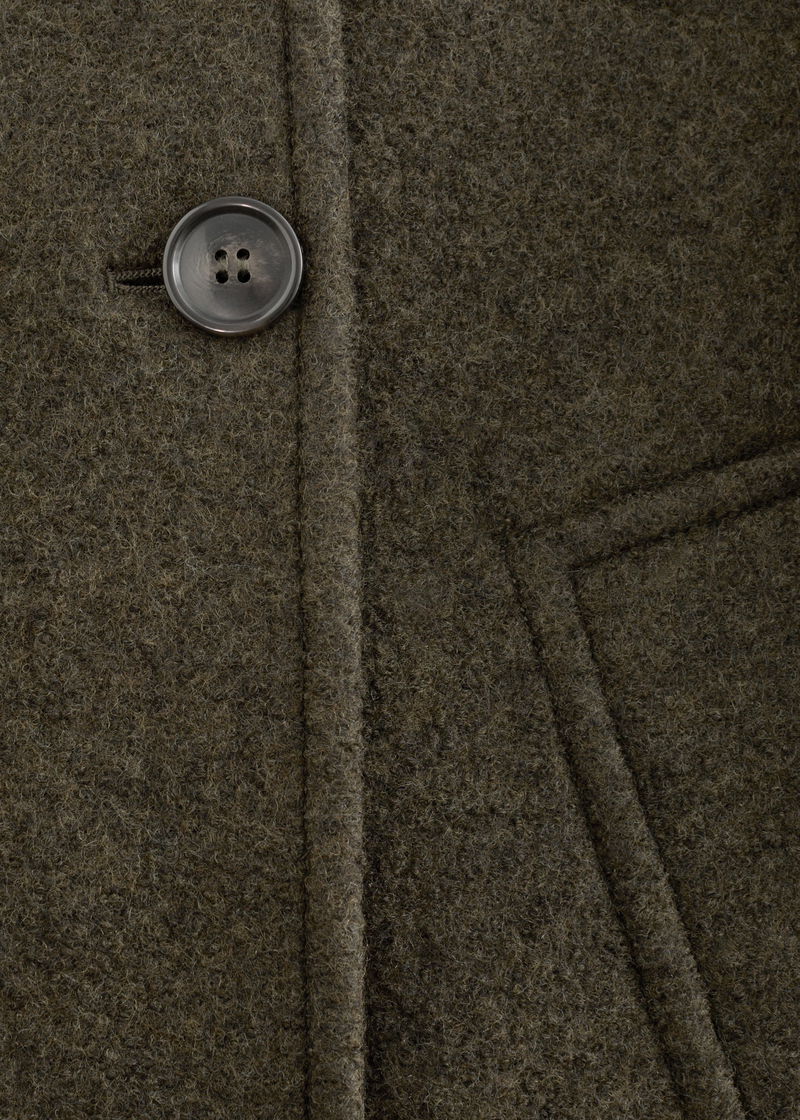 Cut from wool in an oversized silhouette, this jacket features an off-set buttoned opening, a large collar, and gently tapered sleeves with cutline seams. Finished with welt front pockets and an inner pocket.