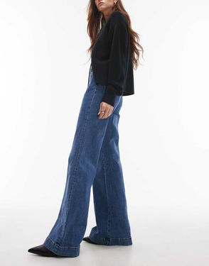 High-waist jeans featuring a flared leg finished with press creases, and duo buttoned flap pockets at the front.