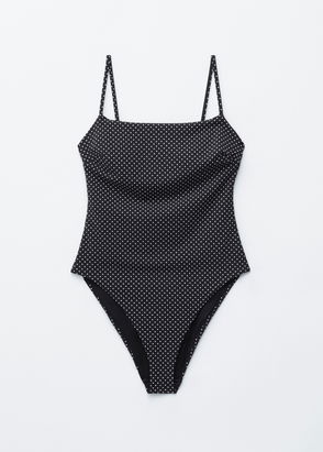 Printed swimsuit with a bustier inspired finish and a cut out detail at the back. Back hook closure Ajustable straps