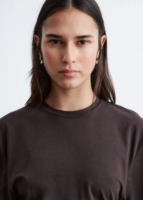 This midi dress is crafted from a lightweight voile fabric with a crinkled finish. Cut in a straight silhouette, it features a plunging v-neck and voluminous puff-sleeves, offering a perfect blend of minimalism and structure.