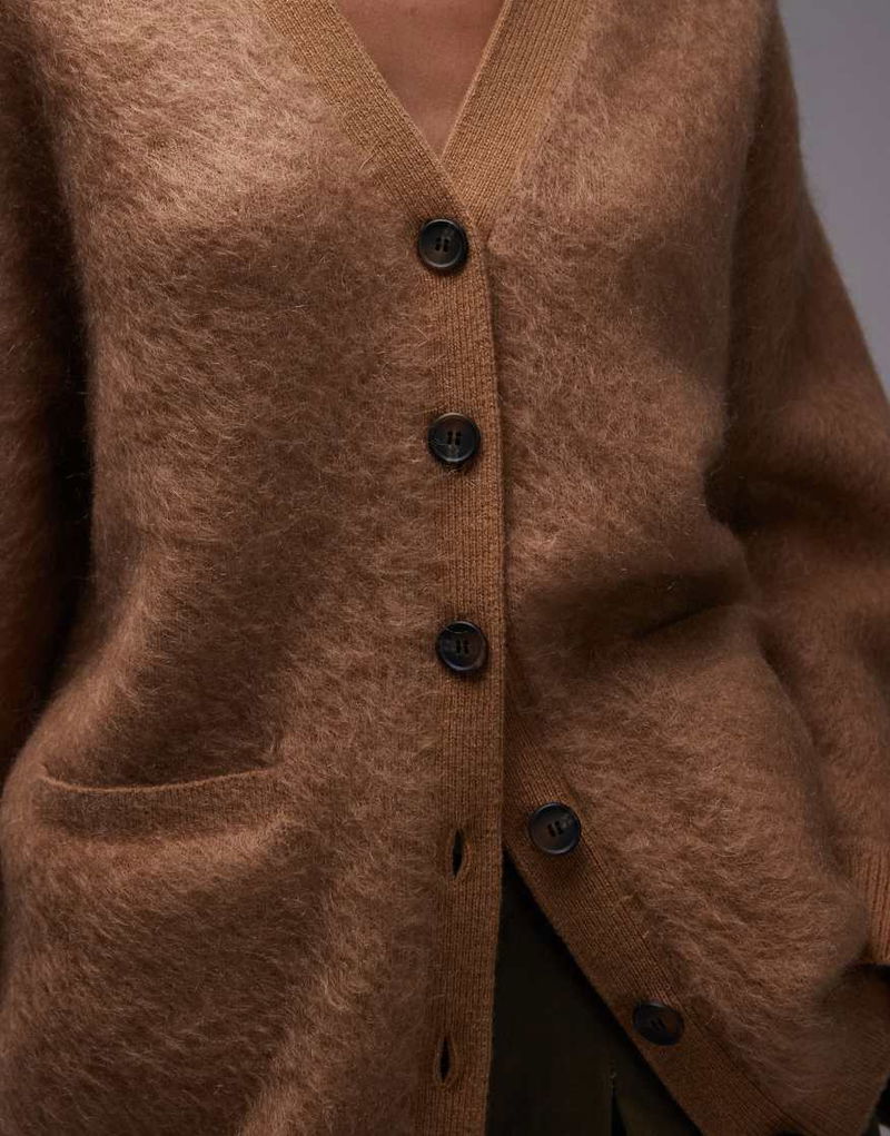 Pure Wool And Mohair Blend Hairy V Neck Cardigan With Front Pockets In Brown