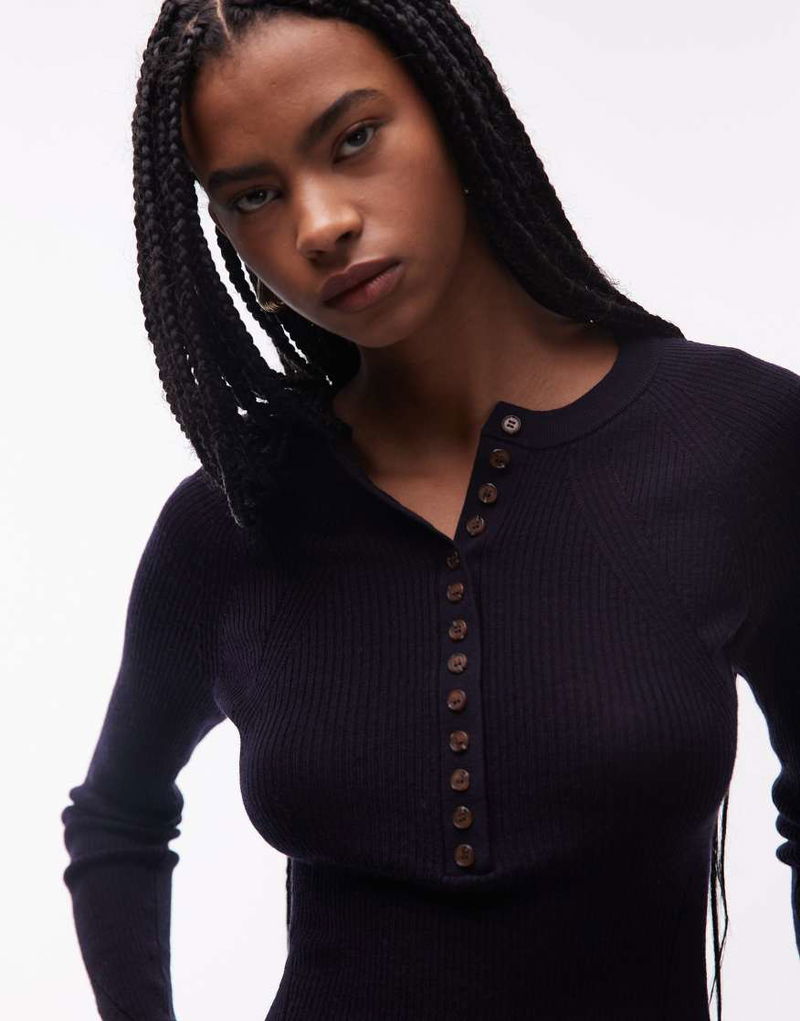 Pure Wool Ribbed Knitted Henley Top In Navy