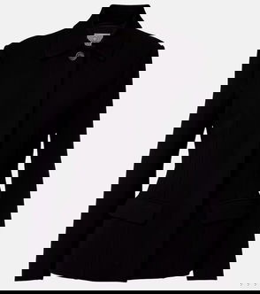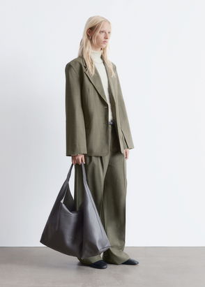 Relaxed single-breasted wool blazer with padded shoulders and a notch lapel collar. Two double jetted pockets with flaps and buttoned cuffs.