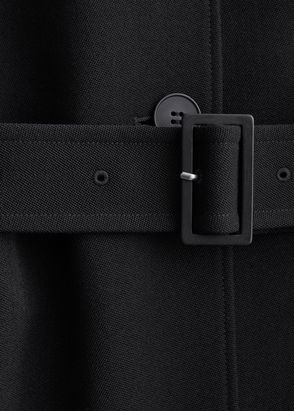 Relaxed double breasted trench coat featuring a tonal self-tie belt, duo welt pockets and button tabs at the cuffs.