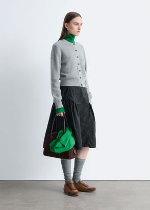 This cardigan is knitted from a soft blend of merino and alpaca wool in a ribbed finish. Cut in a boxy silhouette, it features a round neckline, long sleeves, and subtle front pockets. Light shoulder pads add gentle structure, while tonal knit-covered buttons create a clean, streamlined look. Layer over t-shirts and tanks.