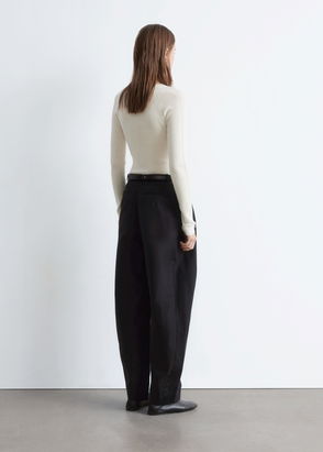 Designed in a sculptural silhouette, it features a classic boatneck and a fitted bodice that shapes to a peplum hem, while vertical rib-knit detailing adds texture and dimension.