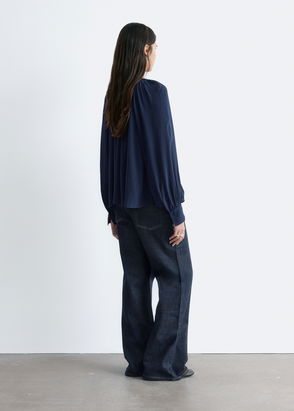 Blouse designed with decorative ruched pleating that falls into a peplum frill hemline. Featuring voluminous balloon-sleeves, and a keyhole closure at the back. Regular fit