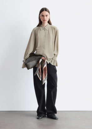 Designed to make a statement, this blouse is cut in a butterfly silhouette with voluminous sleeves accented by bold flounces that cascade down the hem. It features a deep v-neck at the front and back, smocked side panels, and a delicate tie closure at the neck. Pair it with jeans or a simple skirt.