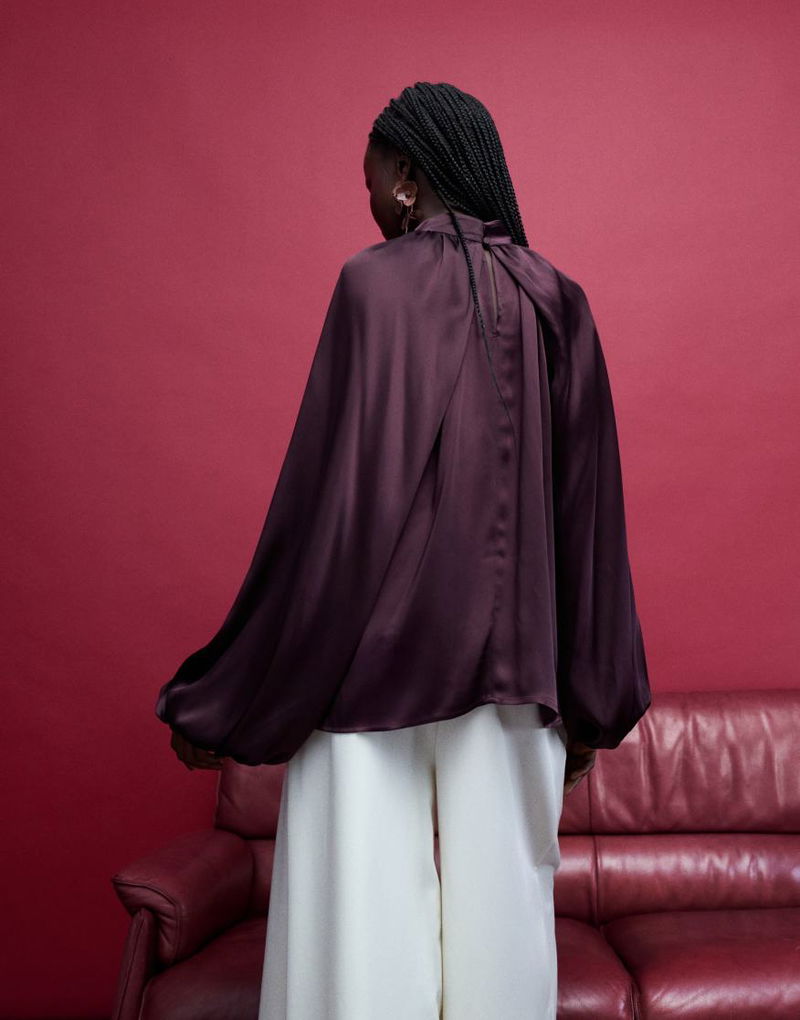 Satin Cape Top With Volume Sleeves In Wine