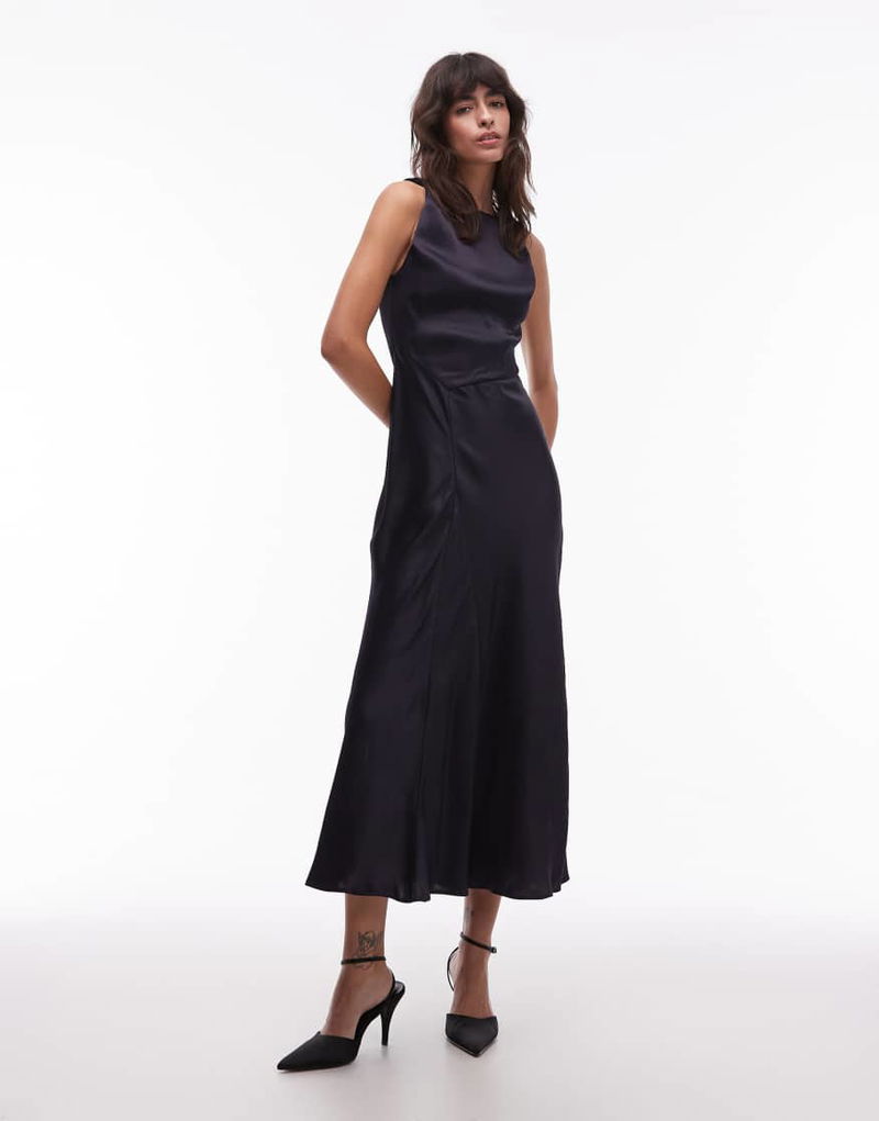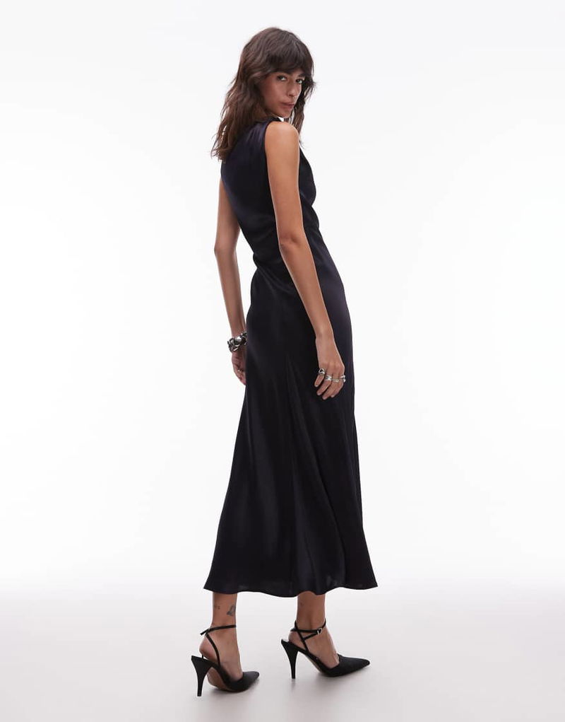 Satin Crepe Midi Dress With Drape Neck In Navy