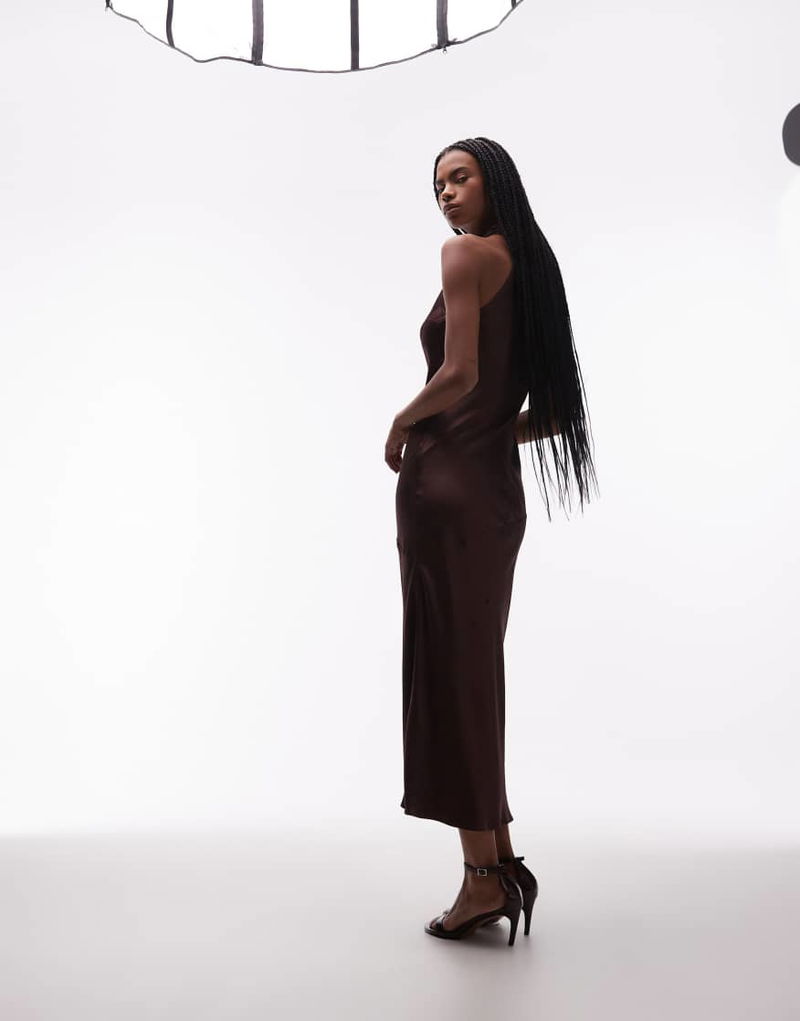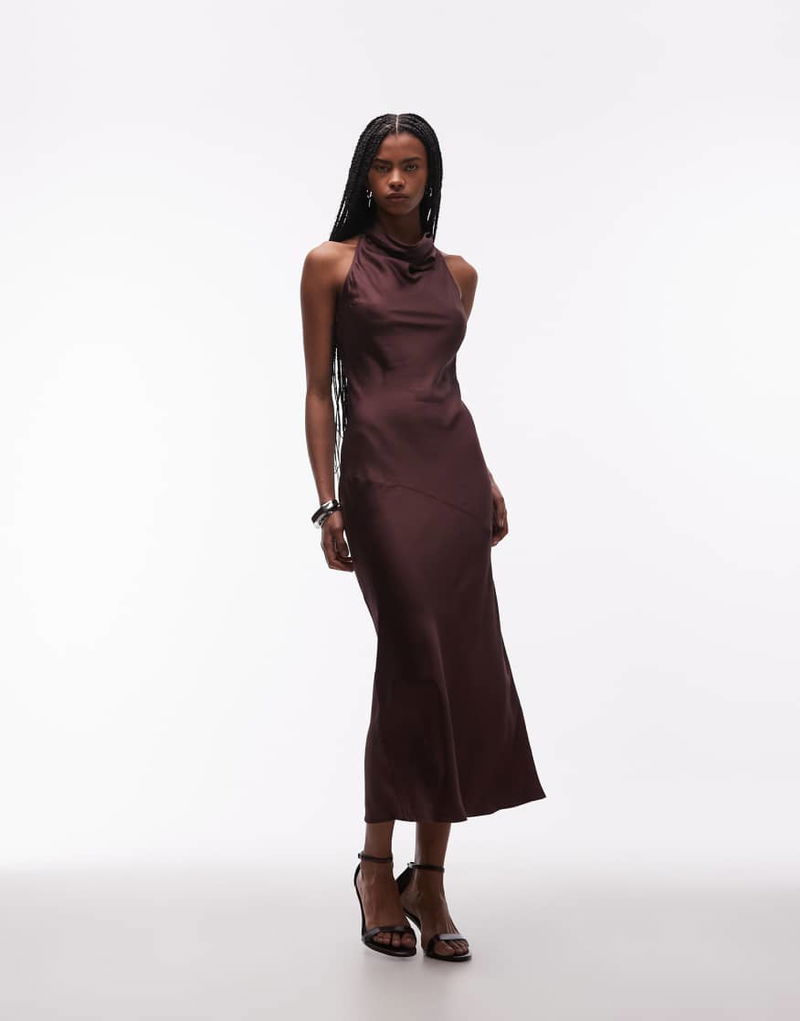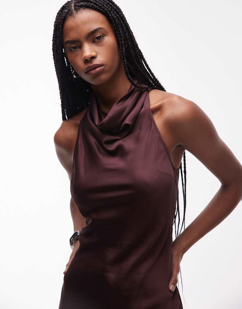Satin Halter Neck Maxi Dress In Chocolate Brown