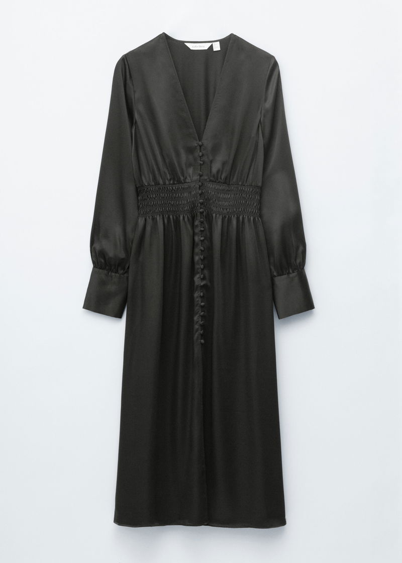 Crafted from fluid satin, this V-neck midi dress is traced with tone-on-tone covered buttons down the front and cut in a loose silhouette with a smocked waist for a nipped-in effect. Finished with long balloon sleeves and wide buttoned cuffs with a double-layer construction.