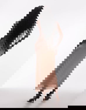 Midi dress crafted from an airy chiffon fabric. Designed with a stand collar featuring a scarf that can be tied as a bow in the back, or wrapped elegantly over one shoulder. It has a decorative pleat detail at the waist, and an asymmetric hem with cascading ruffes. Finished with a low-cut open back, and a concealed side zipper.