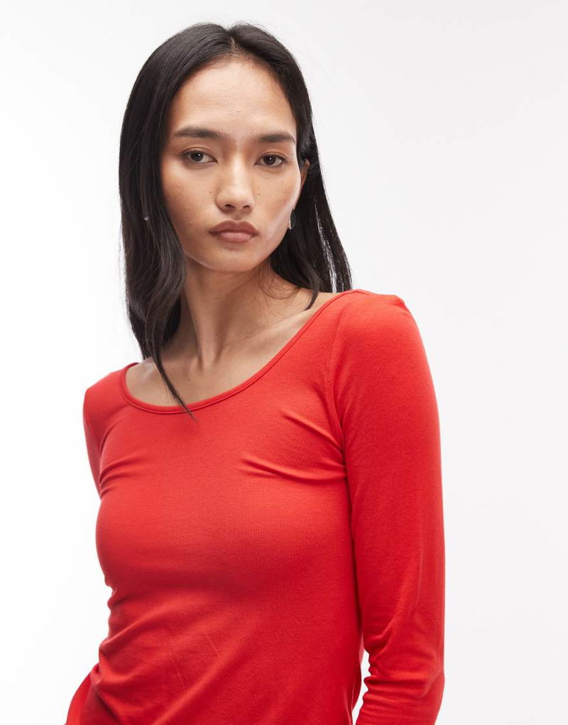 Scoop Back And Front Long Sleeve Slim Fit Top With Thumb Holes In Red