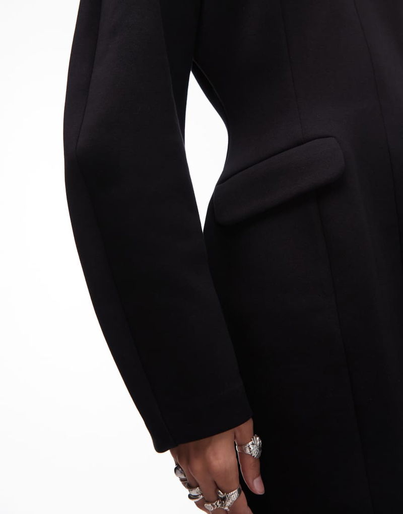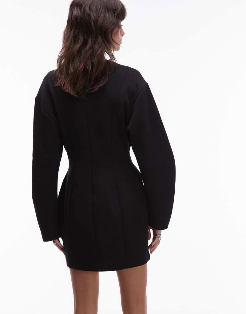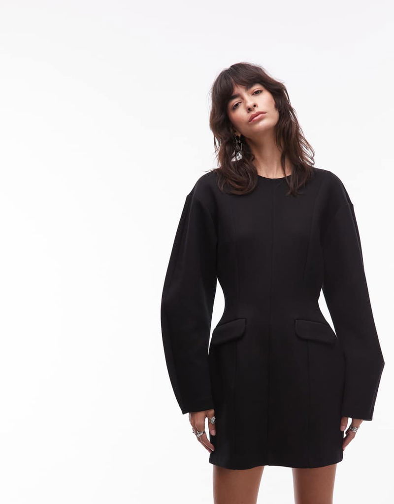 Sculptured Mini Dress With Volume Sleeves And Marked Waist In Black