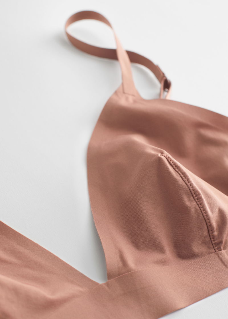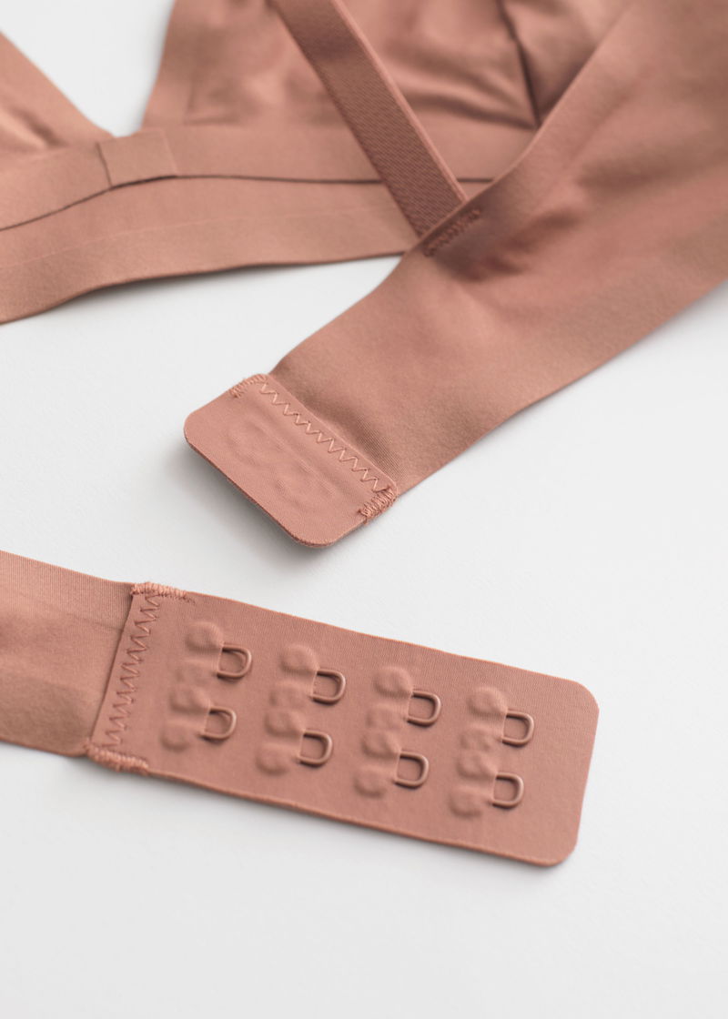 Seamless soft triangle bra with clean bonded edges, adjustable spaghetti straps and duo hook closures.