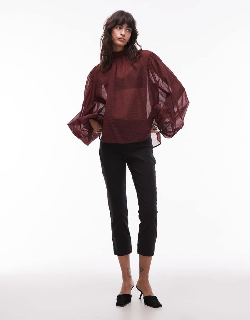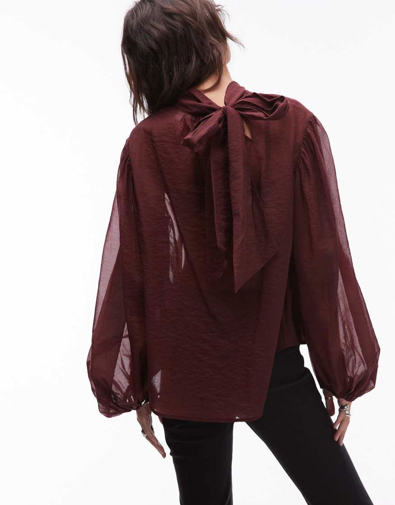 Semi Sheer Blouse With Puff Sleeves And Bow In Burgundy Plum