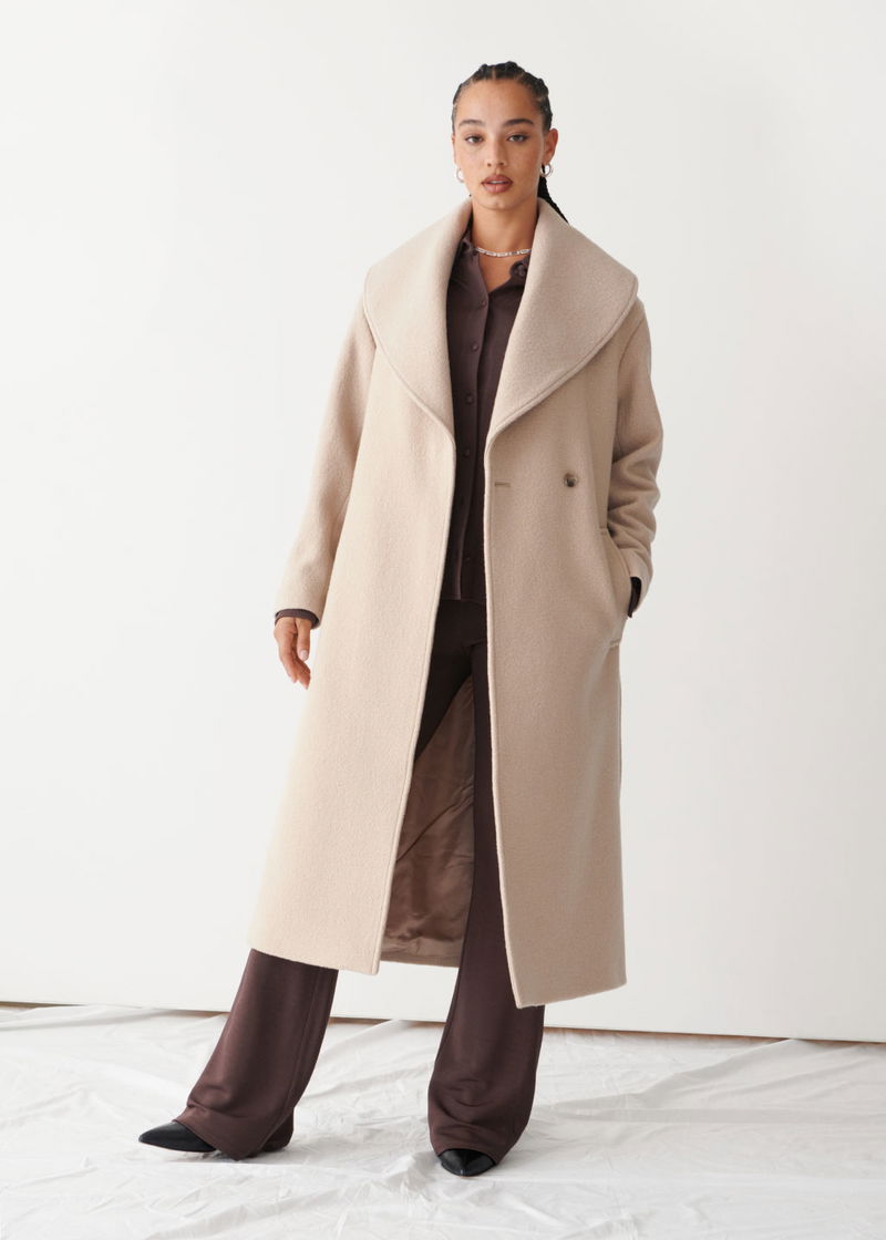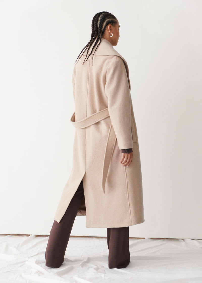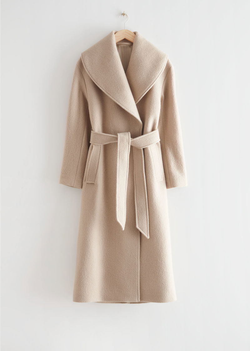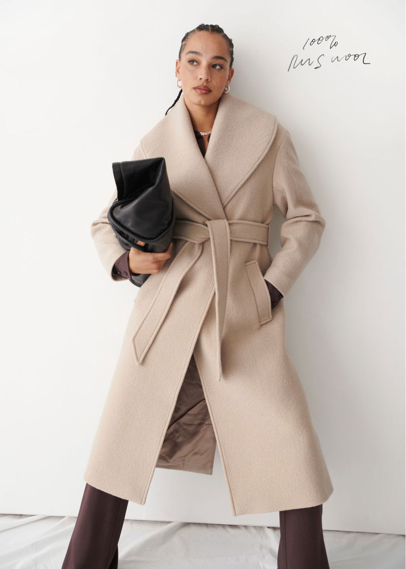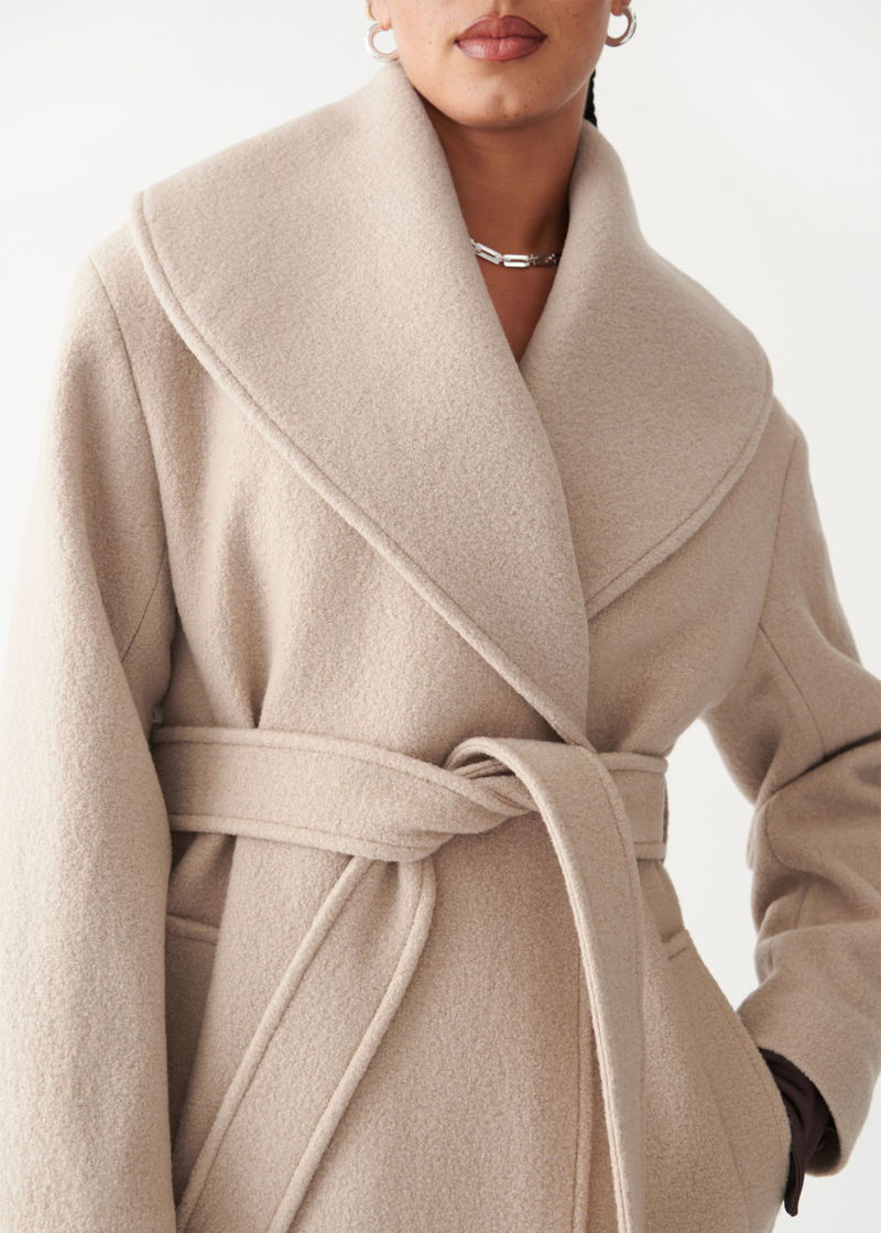 Wool coat featuring a tonal self-tie belt and a large shawl collar.