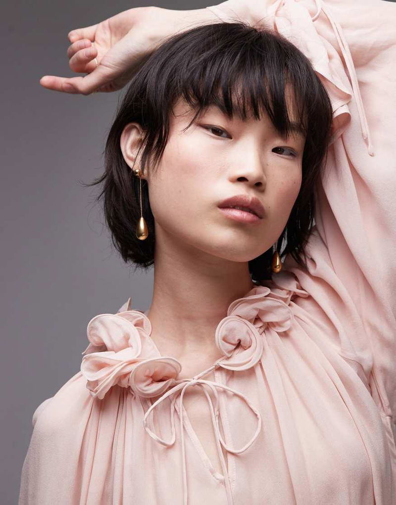 High neck. Tie front. Volume sleeves. Ruffle details.