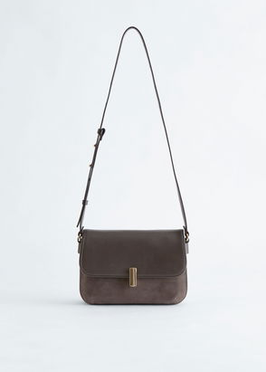 Structured leather flap style bag with three inner compartments, one of which is zippered. Detailed with contrasting leather sides, a magnetic button closure and a removable shoulder strap.