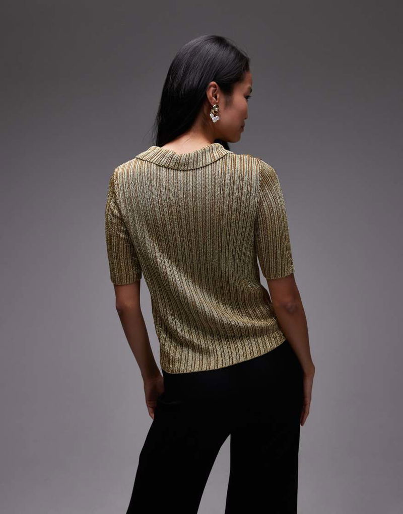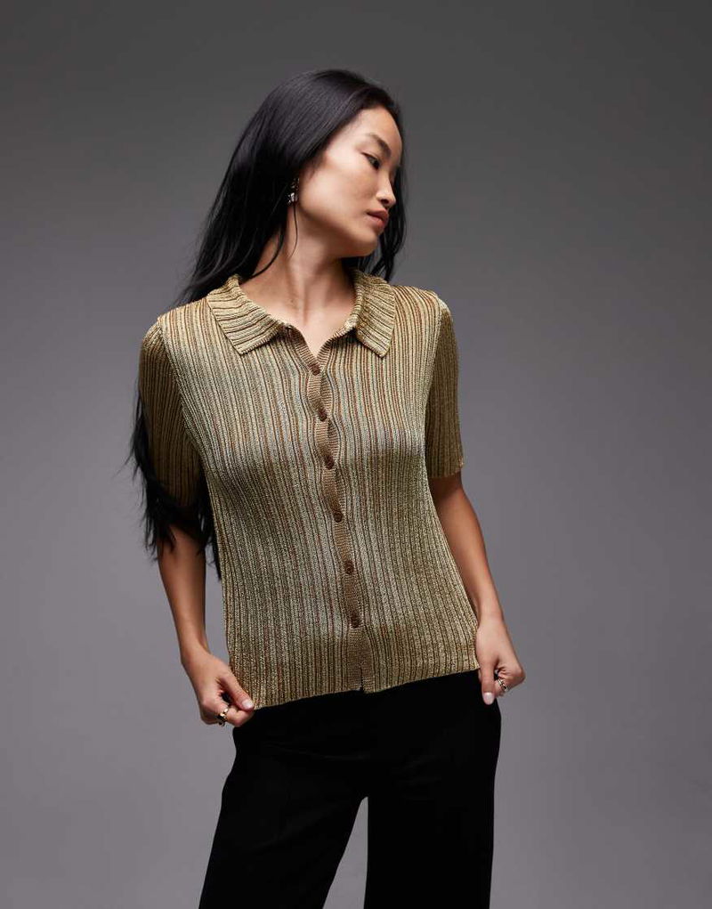 Short Sleeve Knit Top With Decorative Button Fastening In Dark Beige
