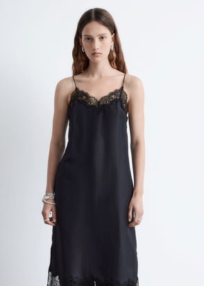 Sleeveless satin dress featuring a glossy, satin finish and a round neckline. Finished with a keyhole closure at the neck.