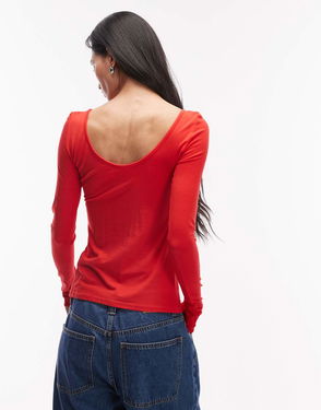 Slim fit long-sleeve top featuring a round neck, extra long sleeves, and a topstitched decorative seam across the front and back.