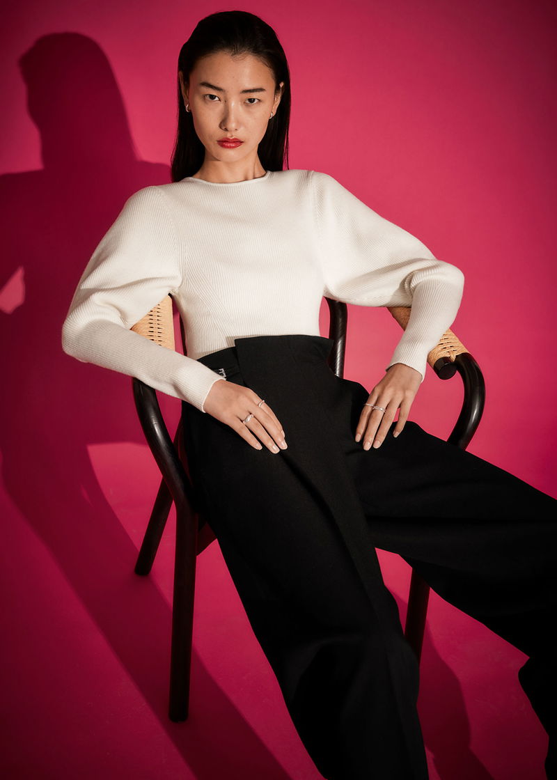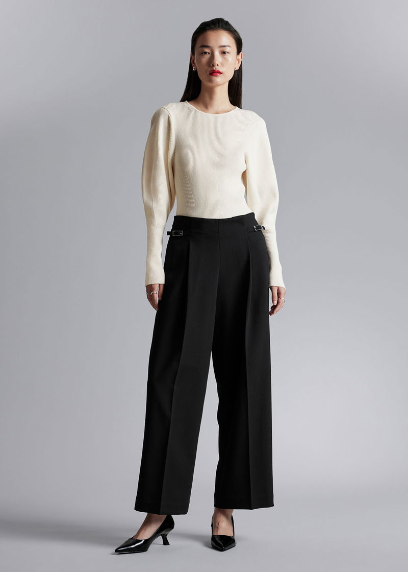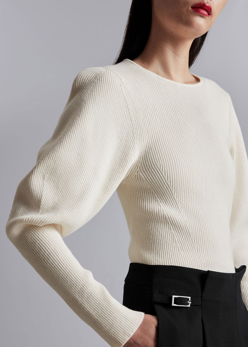Rib-knit jumper featuring puff sleeves finished with long, fitted cuffs. Slim fit. Round neckline.