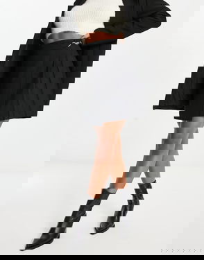 High-waist leather mini skirt featuring an overlapping finish and a centre front slit. Lined Topstitched detailing Zipper at the side.