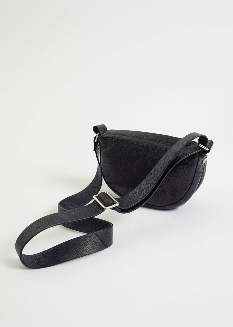 Curved soft leather shoulder bag with outer zippered compartment. Detailed studded side, a zippered closure and adjustable shoulder strap.