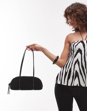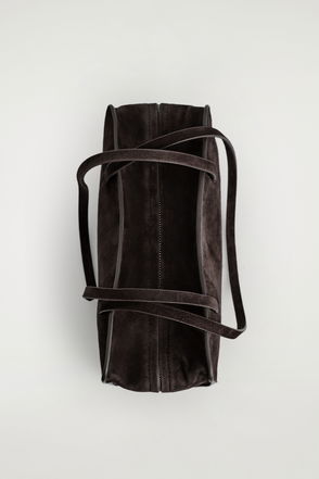This suede shoulder bag draws inspiration from vintage bowling bags, featuring a flat, sturdy base and a curved, low-line silhouette.
