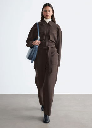 Tailored long-sleeve jumpsuit featuring duo patch pockets and press creases. Secured with a tonal buckle belt. Turn-down collar Centre-front zipper. Duo side pockets. Duo welt back pockets. Buttoned cuffs.