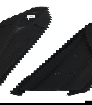 Double-breasted wool-blend pea coat with topstitched lapels, welt pockets, and cuffs with buttoned tabs.