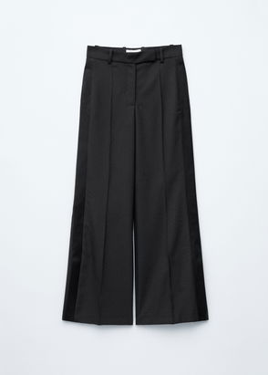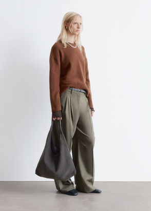 Tailored from a wool blend, these trousers are cut in a loose silhouette with long, wide legs accented by press-creases. They feature slanted side seam pockets, two welt pockets at the back, and a zip fly with hook-and-bar closure.