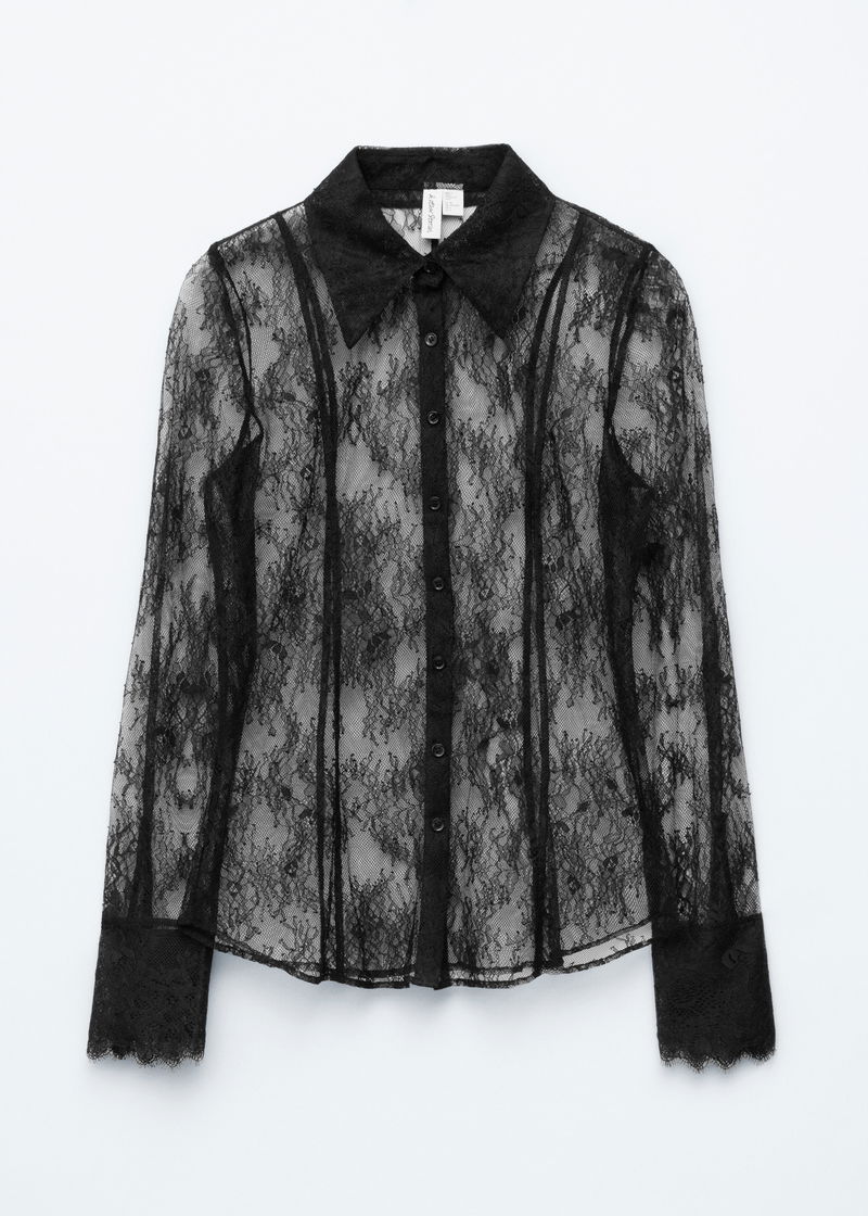 Crafted from delicate lace with a see-through effect, this shirt is cut in a fitted silhouette with a tapered waist. It features a classic collar, cut-line seams, and buttoned cuffs with scalloped trims.