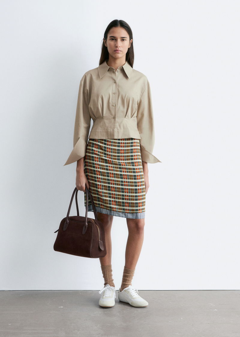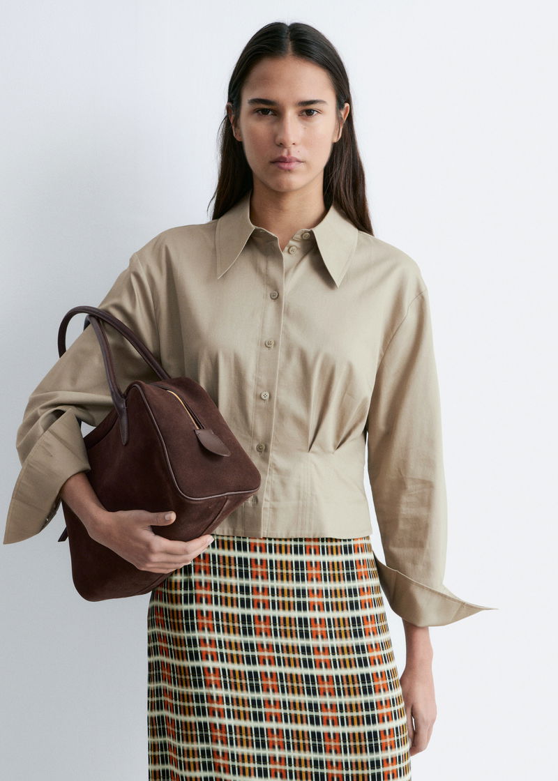 This short shirt features a pointed turn-down collar, front button closures, and long sleeves with buttoned cuffs. A tapered waist with pleats completes the design.