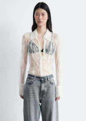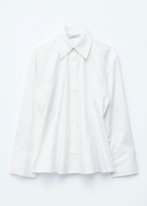 Long-sleeve shirt designed with a classic turn-down collar and a tapered waist with detailed pleats. Featuring a front placket traced with buttons.