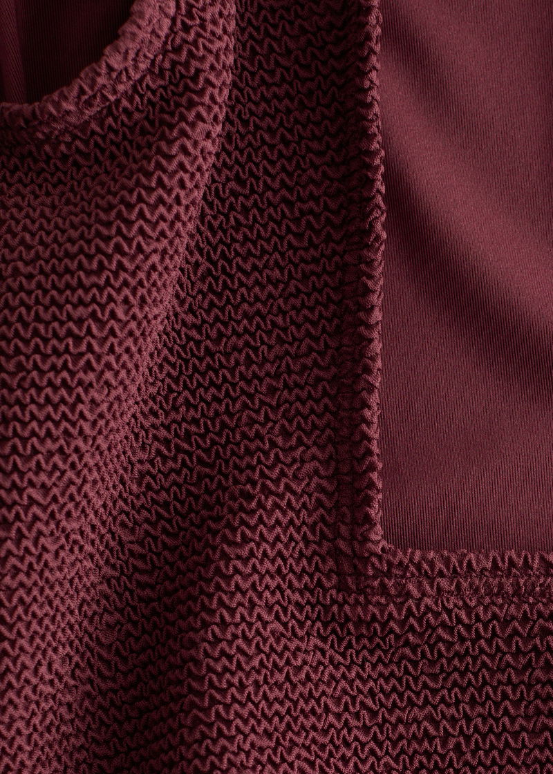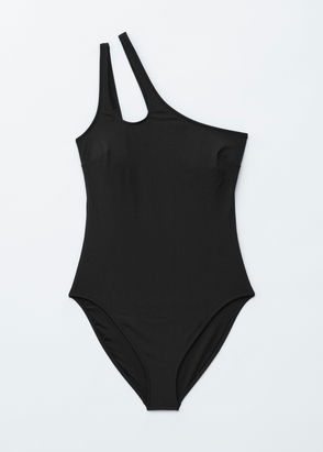 Textured one-piece swimsuit featuring decorative bow ties at the shoulders and a squared neckline.